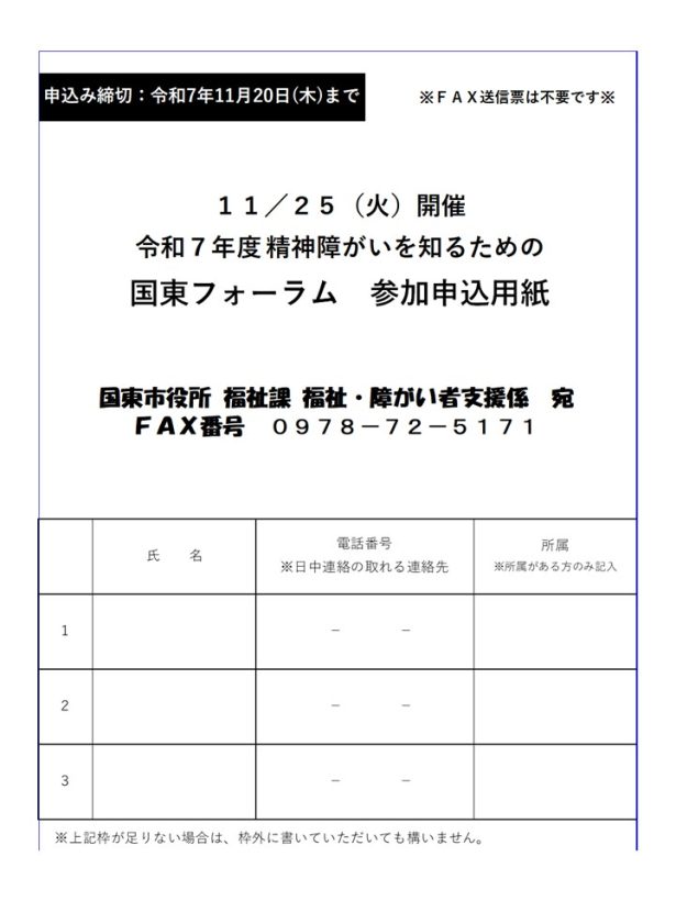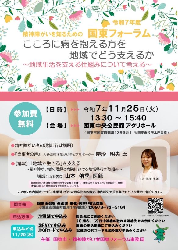 精神障がい者への理解を深め、地域で生きることをどう支えていくことができるかを考える機会とするため、精神障がいを知るための国東フォーラムを開催します。